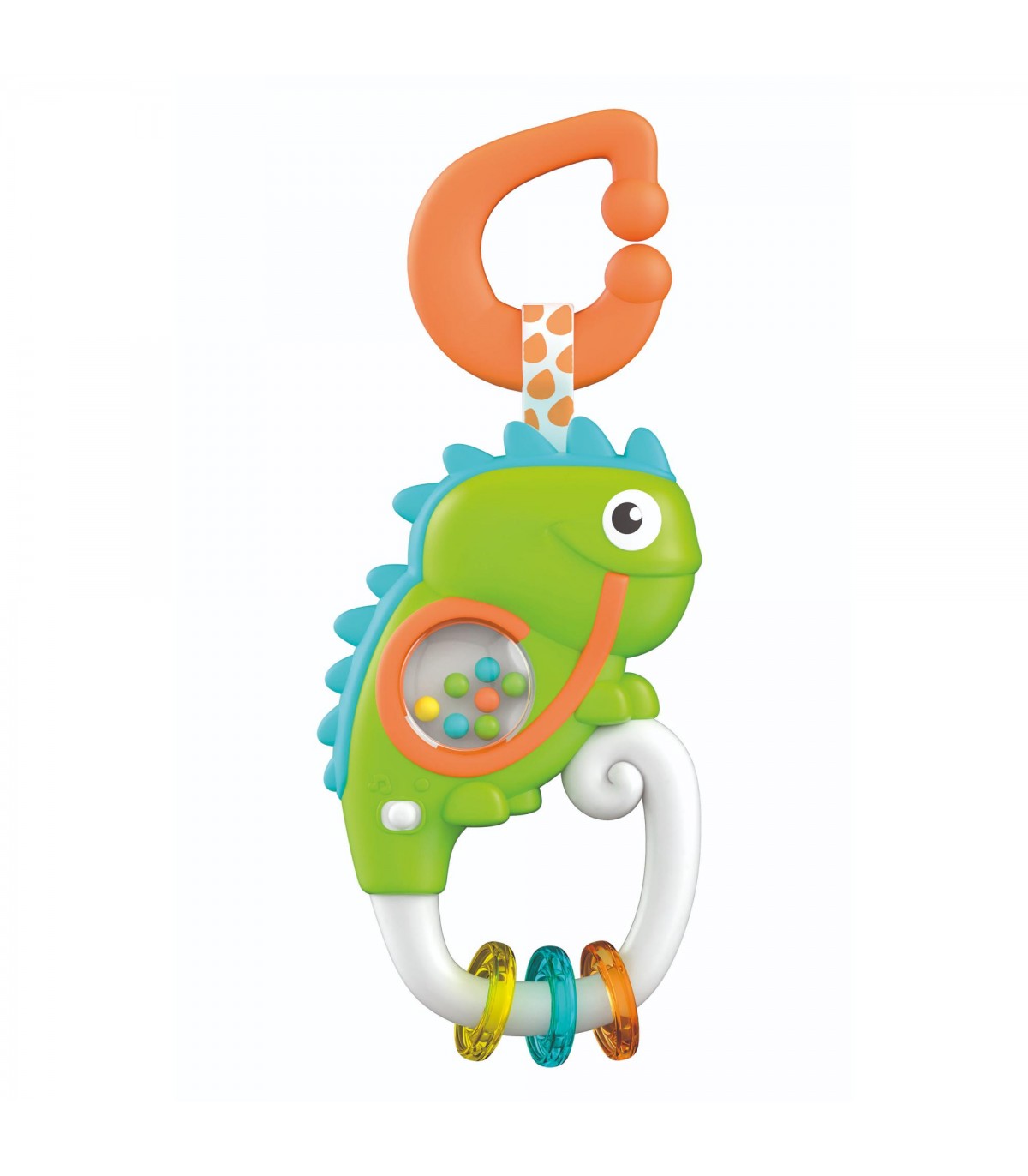 Il simpatico sonaglino a forma di camaleonte diventerà il passatempo dei più piccoli! Muovendolo il sonaglino attiva allegre melodie ed effetti sonori, mentre le palline nella pancia del camaleonte e i ciondoli colorati attirano l'attenzione del bambino stimolando la percezione tattile Il pratico gancio è perfetto per appendere il sonaglino e portarlo sempre con sé.