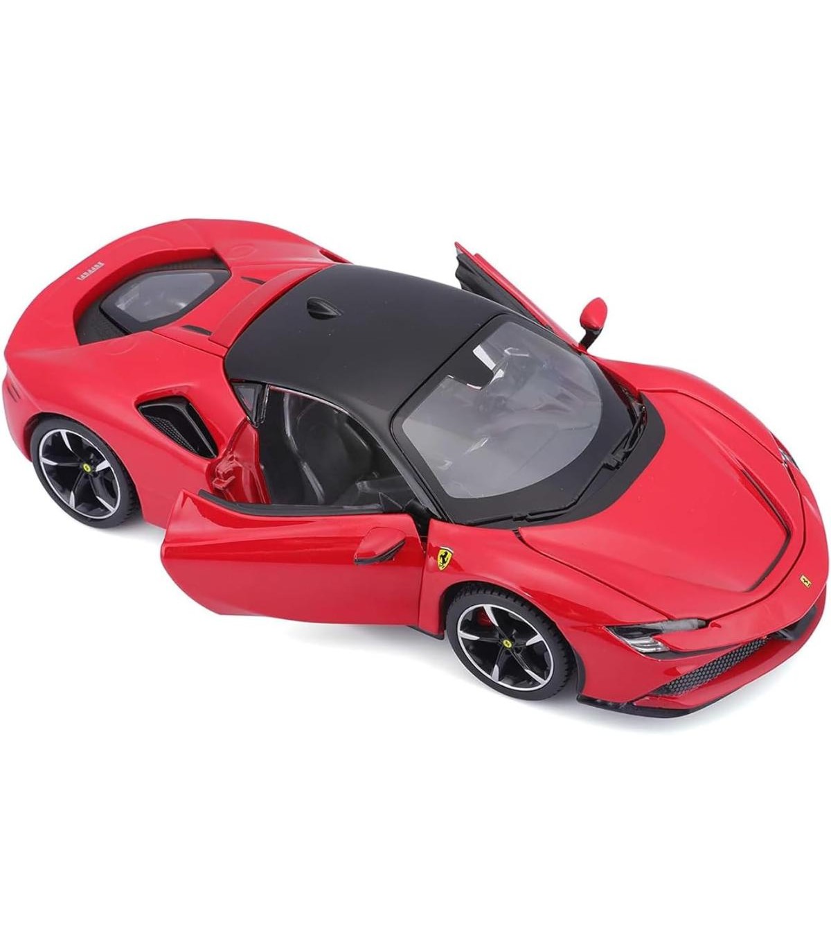 Riproduzione di automobile in diecast, scala 1:24 Sf90 Stradale, con dettagli realistici, porte apribili, sterzo funzionante e interni dettagliati.