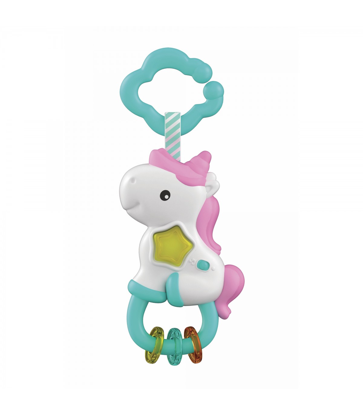 Un magico unicorno per intrattenere il bambino con luci e musiche! Con un pulsante luminoso a forma di stella e ciondoli colorati per creare simpatici effetti sonori. Il pratico anello è pensato per agganciare il sonaglino alla culla o al passeggino e portarlo sempre con sè.