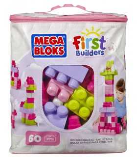 Nuovissima sacca colorata rosa in materiale ecologico con cerniera richiudibile contenente 60 maxi mattoncini coloratissimi Mega Bloks First Builders per ore ed ore di divertimento.
