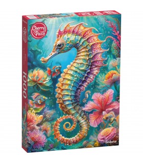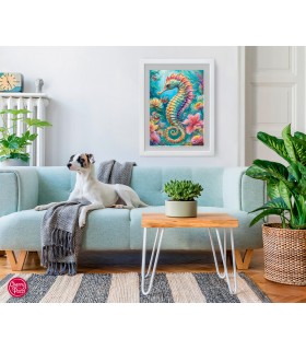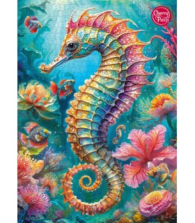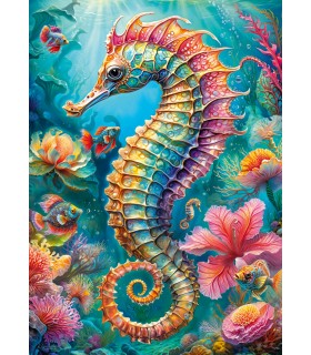 In una vista sottomarina affascinante, un cavalluccio marino si muove agilmente tra coralli vibranti e pesci rapidi. La scena è viva di colore e movimento, mentre la forma delicata del cavalluccio marino si intreccia...